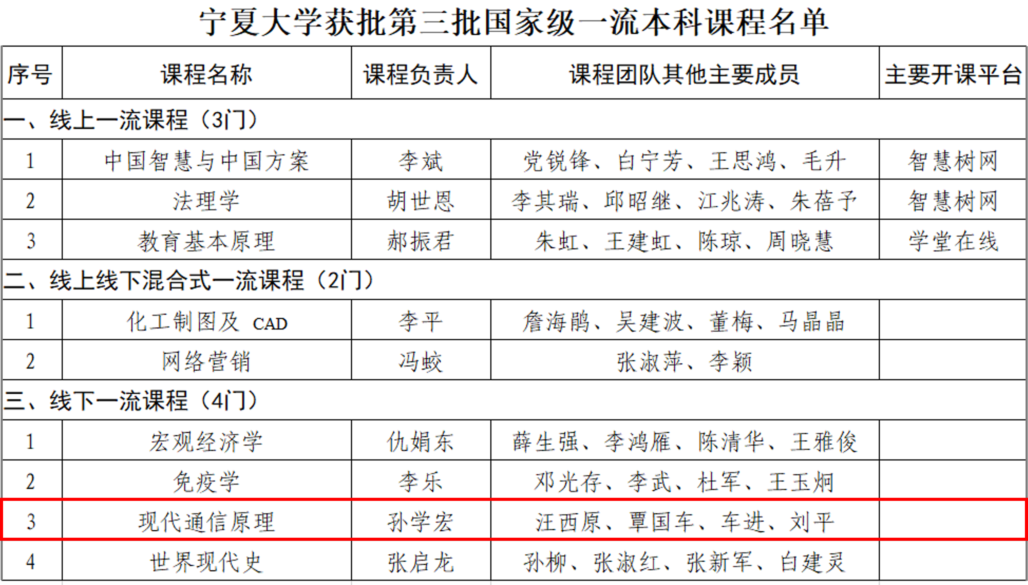 【电院讯】近日,教育部公布第三批国家级一流本科课程认定结果。宁夏大学共有9门课程获批国家级一流本科课程,包括线上课程3门、线下课程4门、线上线下混合式课程2门。其中,我院孙学宏教授团队主持的《现代通信原理》课程获批“线下一流课程”。