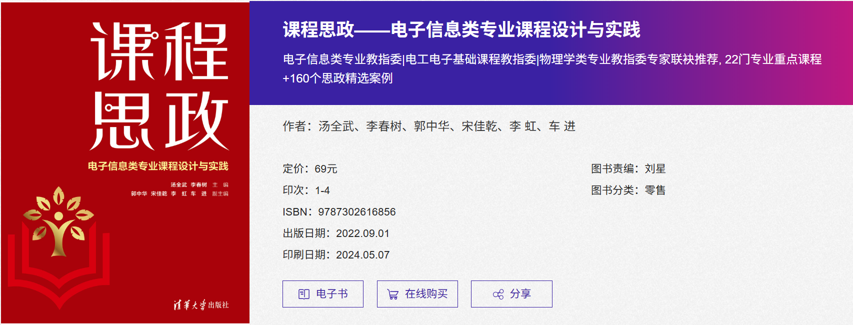 同期,从自治区哲学社会科学评奖领域再传佳讯。汤全武教授团队编著的《课程思政——电子信息类专业课程设计与实践》一书,荣获宁夏第十六届哲学社会科学优秀成果奖。该奖项是自治区哲学社会科学领域的权威奖项,旨在表彰对推动宁夏哲学社会科学繁荣发展具有重要价值的优秀研究成果。著作聚焦立德树人根本任务,系统探索了电子信息类专业课程与思政教育深度融合的理论路径与实践模式,提供了丰富的课程思政教学案例与解决方案,对强化专业课程的育人功能、培养德才兼备的创新型工程人才具有重要的理论价值与实践指导意义。此项获奖,标志着我院在推动工程技术教育与哲学社会科学交叉融合,特别是在新工科课程思政建设与研究方面取得了创新性成果。