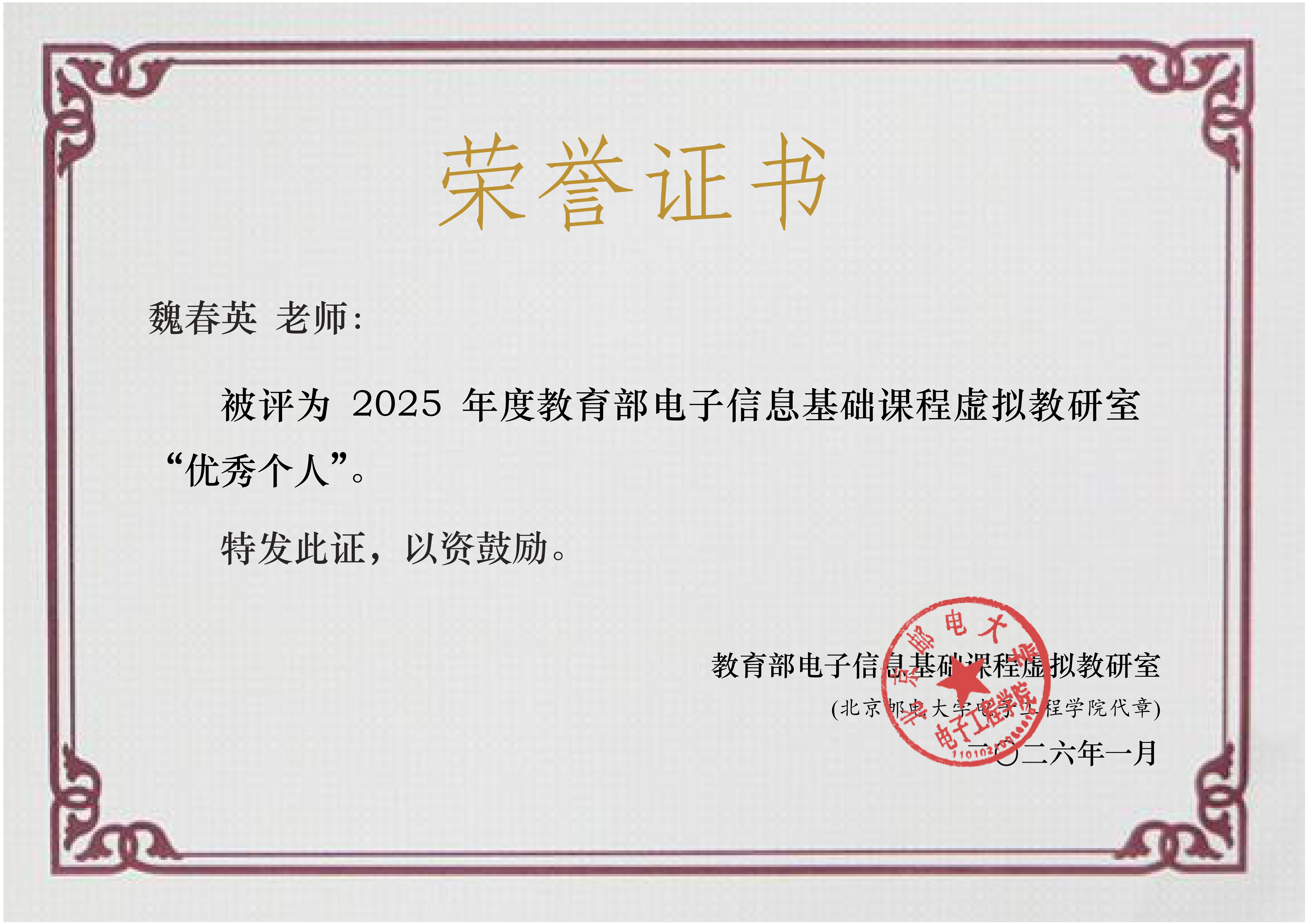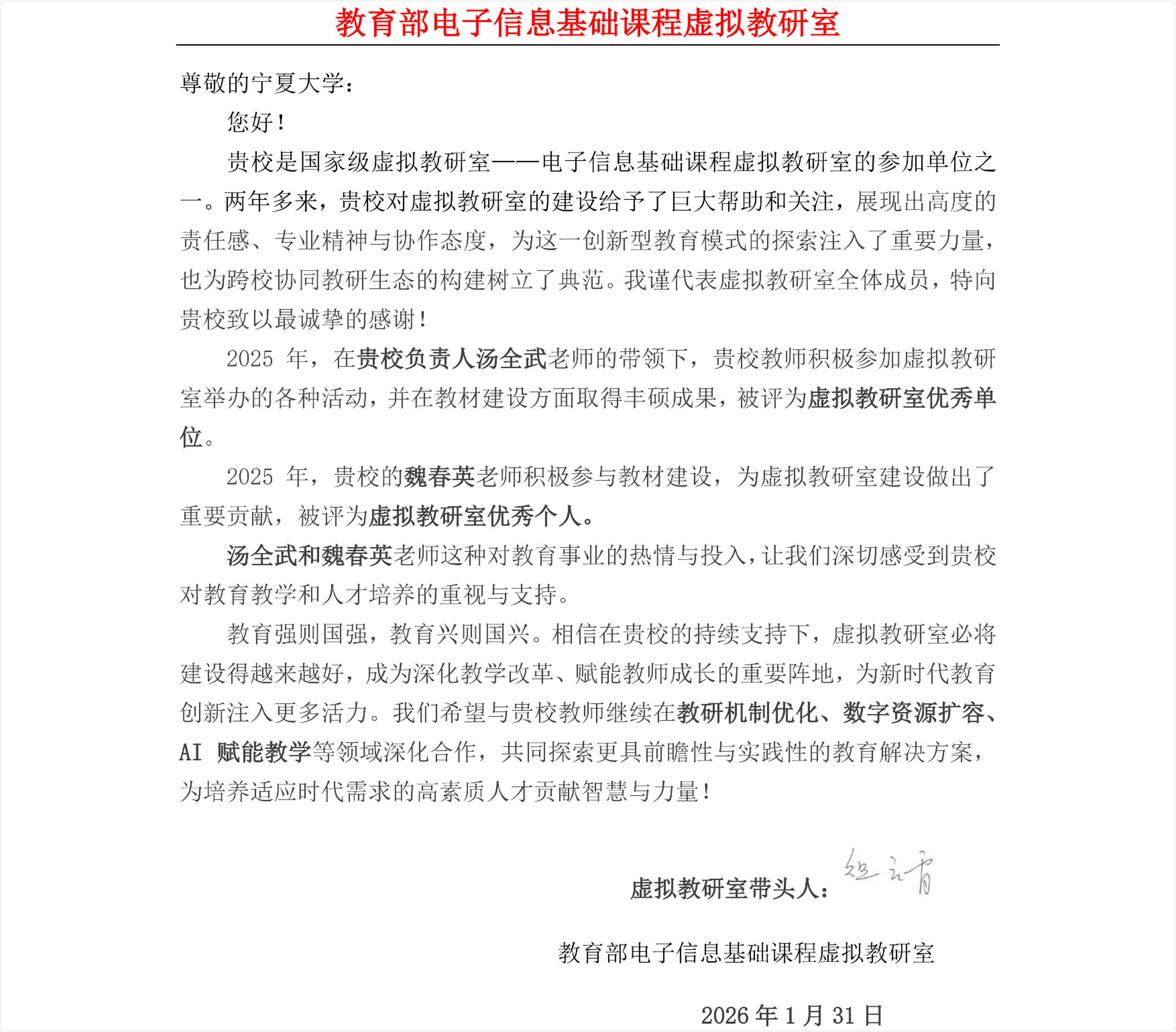 【电院讯 魏春英/文、图】近日,教育部电子信息基础课程虚拟教研室公布2025年度建设成果评选结果,我院获评“优秀单位”,魏春英老师荣获“优秀个人”称号。同时,向我院发来感谢信,对我院在虚拟教研室建设中的大力支持与重要贡献致以诚挚感谢。